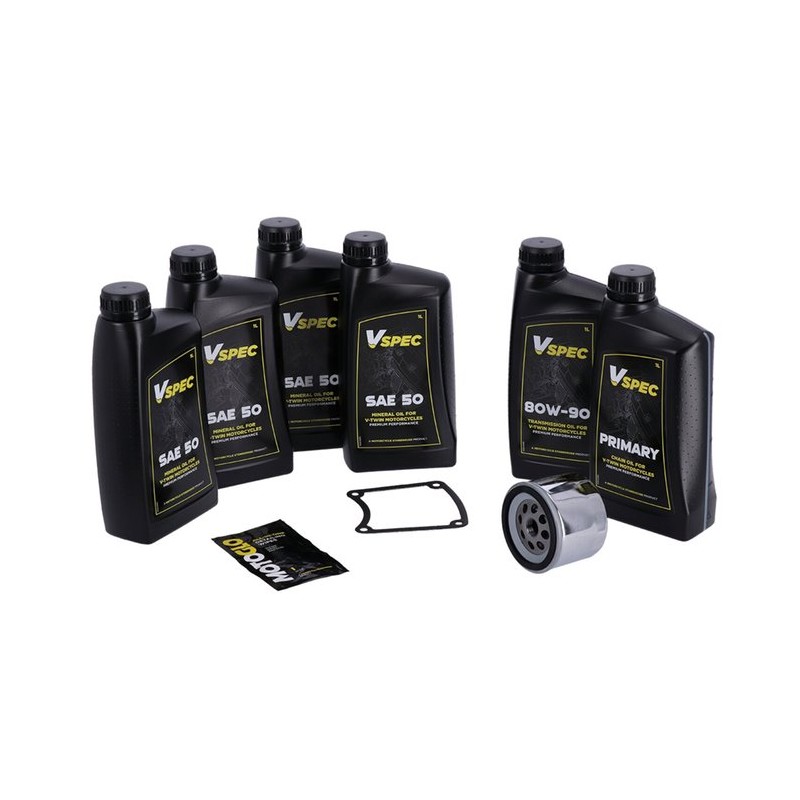 Ce kit comprend : 4 litres d'huile moteur minérale SAE 50, un filtre à huile chromé 63782-80, 1 litre d'huile de carter primaire, 1 litre d'huile de transmission 80W90 et un joint de couvercle d'inspection 34906-85D. Huile moteur minérale monograde SAE 50 Vspec de haute qualité pour motos nécessitant une huile minérale monograde. Conforme ou supérieure à la norme JASO MA/2. Ce kit « Big Oil » contient suffisamment d'huile Vspec pour le moteur, la transmission et le carter primaire des modèles mentionnés. Il inclut un filtre à huile vissable chromé ou noir, tous les joints de bouchon de vidange nécessaires et un joint de couvercle d'inspection/de carter primaire. Le kit « Big Oil » est idéal pour une vidange complète de votre moto lors d'un entretien périodique ou avant l'hivernage. Remarque : Contient de l'huile moteur Vspec authentique de haute qualité pour tous les moteurs, des modèles de série aux moteurs haute performance. Remarque : Les références OEM sont données à titre indicatif uniquement. Remarque : L'huile usagée peut contenir des acides nocifs et/ou d'autres contaminants. Il est donc conseillé d'effectuer une vidange d'huile et un changement de filtre avant l'hivernage. Remarque : Consultez votre manuel d'entretien pour connaître les préconisations du constructeur concernant la vidange d'huile.