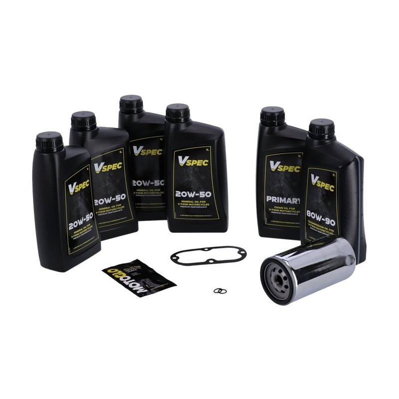 Ce kit comprend : 6 litres d'huile moteur/boîte primaire/transmission 3-en-1 100% synthétique SAE 20W50, un filtre à huile chromé extra long (identique à celui d'origine) 63813-90, un joint de couvercle d'inspection 60567-90C et un bouchon de vidange avec joint torique 11105. Huile Vspec 20W50 100% synthétique de haute qualité. Solution tout-en-un. Utilisable comme huile moteur, boîte primaire et transmission. Miscible avec toutes les huiles minérales et semi-synthétiques. Conforme ou supérieur à la norme JASO MA/2. Notre kit « Big Oil » contient la quantité d'huile Vspec nécessaire pour l'entretien des modèles mentionnés. Le kit inclut un filtre à huile vissable chromé ou noir, tous les joints de bouchon de vidange et un joint de couvercle d'inspection/de boîte primaire. Le kit « Big Oil » est idéal pour une vidange complète de votre moto lors d'un entretien périodique ou avant l'hivernage. Remarque : Contient une huile moteur Vspec authentique de haute qualité pour tous les moteurs, des modèles de série aux moteurs haute performance. Remarque : Les références des pièces d'origine sont fournies à titre indicatif uniquement. Remarque : L'huile usagée peut contenir des acides nocifs et/ou d'autres contaminants. Il est donc conseillé d'effectuer une vidange d'huile et un changement de filtre avant l'hivernage. Remarque : Consultez votre manuel d'entretien pour connaître les intervalles de vidange et les quantités d'huile recommandés par le constructeur.