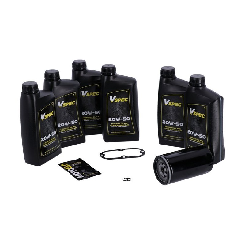 Ce kit comprend : 6 litres d'huile moteur/boîte primaire/transmission 100% synthétique SAE 20W50 3-en-1, un filtre à huile noir extra long (configuration d'origine) 63812-90, un joint de couvercle d'inspection 60567-90C et un bouchon de vidange avec joint torique 11105. Huile Vspec 20W50 100% synthétique de haute qualité. Solution tout-en-un. Utilisable comme huile moteur, boîte primaire et transmission. Miscible avec toutes les huiles minérales et semi-synthétiques. Conforme ou supérieur à la norme JASO MA/2. Notre kit « Big Oil » contient suffisamment d'huile Vspec pour moteur, boîte de vitesses et boîte primaire pour l'entretien des modèles mentionnés. Le kit inclut un filtre à huile vissable chromé ou noir, tous les joints de bouchon de vidange nécessaires et un joint de couvercle d'inspection/de boîte primaire. Le kit « Big Oil » est idéal pour une vidange complète de votre moto lors d'un entretien périodique ou avant l'hivernage. Remarque : Contient une huile moteur Vspec authentique de haute qualité pour tous les moteurs, des modèles de série aux moteurs haute performance. Remarque : Les références des pièces d'origine sont fournies à titre indicatif uniquement. Remarque : L'huile usagée peut contenir des acides nocifs et/ou d'autres contaminants. Il est donc conseillé d'effectuer une vidange d'huile et un changement de filtre avant l'hivernage. Remarque : Consultez votre manuel d'entretien pour connaître les intervalles de vidange et les quantités d'huile recommandés par le constructeur.