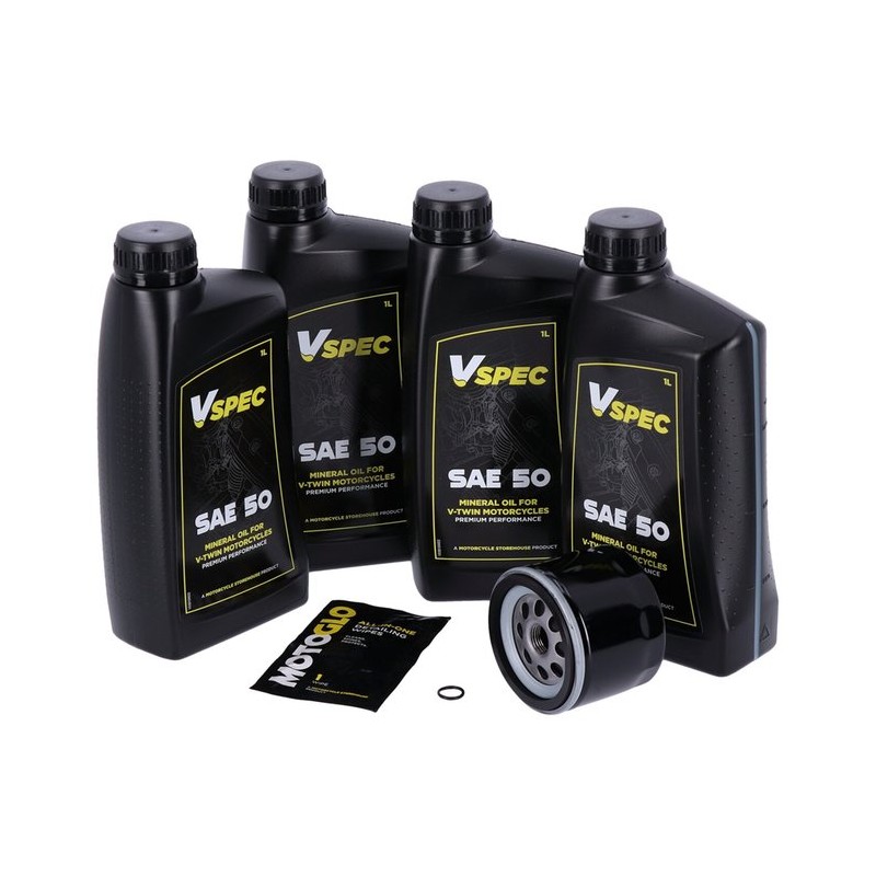 Bidon de 4 litres. Filtre à huile noir (référence 63782-80 / 63810-80A, modèle court). Kit d'entretien de base comprenant un filtre à huile, un bouchon de vidange avec joint torique et suffisamment d'huile moteur pour le modèle spécifié. Utilisé pour l'entretien de votre moto lors d'une révision périodique ou avant l'hivernage. Remarque : Livré avec de l'huile moteur minérale monograde SAE Vspec de haute qualité, spécialement conçue pour les moteurs classiques nécessitant une huile SAE 50. Remarque : L'huile usagée peut contenir des acides nocifs et/ou d'autres contaminants. Il est donc conseillé de procéder à une vidange et au remplacement du filtre avant l'hivernage. Remarque : Consultez votre manuel d'entretien pour connaître les intervalles de vidange recommandés par le constructeur.