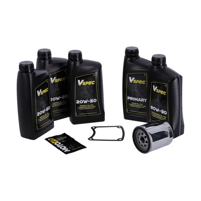 Ce kit comprend : 3 litres d'huile moteur minérale SAE 20W50, un filtre à huile chromé 63796-77A, 1 litre d'huile pour carter primaire, 1 litre d'huile de transmission 80W90 et un joint de couvercle d'inspection 34906-85D. Huile moteur minérale multigrade Vspec SAE 20W50 de haute qualité pour motos nécessitant une huile moteur minérale. Conforme ou supérieure à la norme JASO MA/2. Notre kit « Big Oil » contient suffisamment d'huile Vspec pour le moteur, la transmission et le carter primaire pour l'entretien des modèles mentionnés. Le kit inclut un filtre à huile vissable chromé ou noir, tous les joints de bouchon de vidange nécessaires et un joint de couvercle d'inspection/de carter primaire. Le kit « Big Oil » est idéal pour une vidange complète de votre moto lors d'un entretien périodique ou avant l'hivernage. Remarque : Contient de l'huile moteur Vspec authentique de haute qualité pour tous les moteurs, des modèles de série aux moteurs haute performance. Remarque : Les références OEM sont données à titre indicatif uniquement. Remarque : L’huile usagée peut contenir des acides nocifs et/ou d’autres contaminants. Il est donc conseillé de procéder à une vidange d’huile et au remplacement du filtre avant l’hivernage. Remarque : Consultez votre manuel d’entretien pour connaître les intervalles de vidange et les quantités d’huile recommandés par le constructeur.