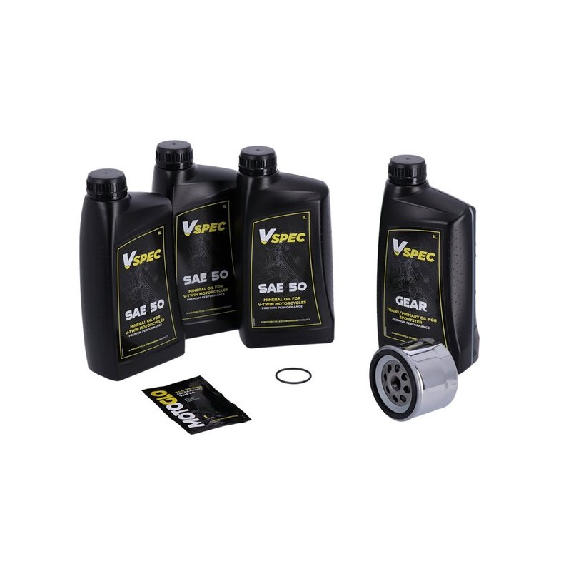 Ce kit comprend : 3 litres d'huile moteur minérale SAE 50, un filtre à huile chromé 63782-80, 1 litre d'huile de transmission/carter primaire, et un bouchon de remplissage primaire avec joint torique 11139. Huile moteur minérale monograde SAE 50 Vspec de haute qualité pour motos nécessitant une huile minérale monograde. Conforme ou supérieure à la norme JASO MA/2. Ce kit « Big Oil » contient suffisamment d'huile Vspec pour le moteur, la transmission et le carter primaire des modèles mentionnés. Il inclut un filtre à huile vissable chromé ou noir, tous les joints de bouchon de vidange nécessaires et un joint de couvercle d'inspection/de denture primaire. Le kit « Big Oil » est idéal pour une vidange complète de votre moto lors d'un entretien périodique ou avant l'hivernage. Remarque : Contient de l'huile moteur Vspec authentique de haute qualité pour tous les moteurs, des modèles de série aux moteurs hautes performances. Remarque : Les références OEM sont données à titre indicatif uniquement. Remarque : L'huile usagée peut contenir des acides nocifs et/ou d'autres contaminants. Il est donc conseillé d'effectuer une vidange d'huile et un changement de filtre avant l'hivernage. Remarque : Consultez votre manuel d'entretien pour connaître la vidange d'huile recommandée par le constructeur.