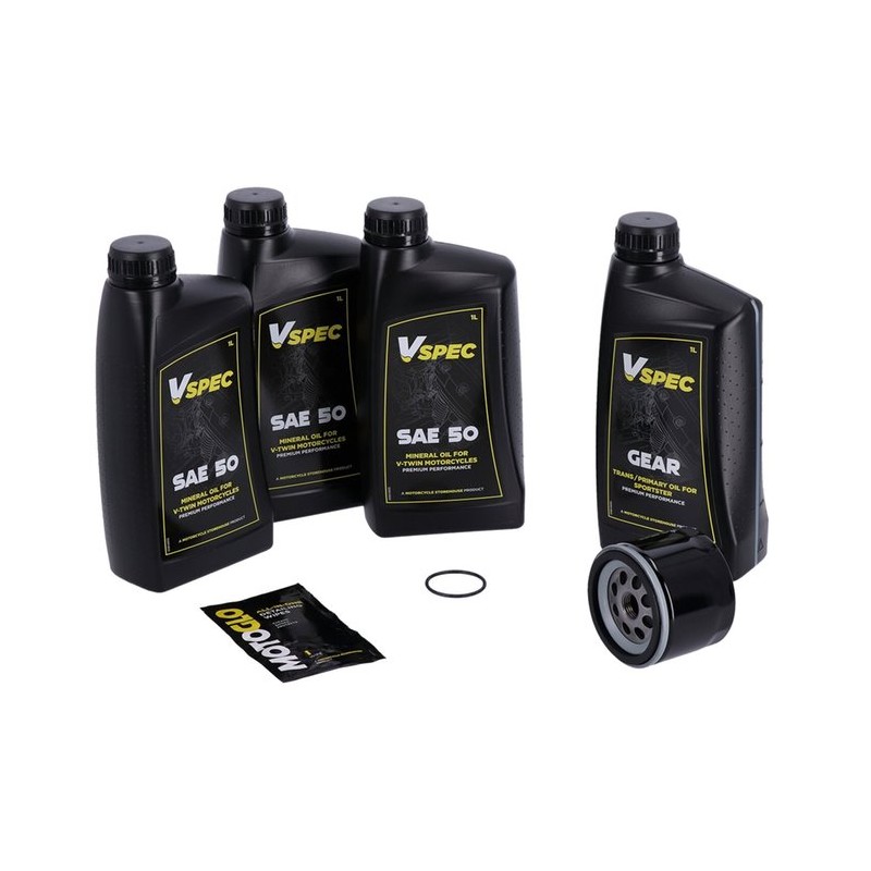 Ce kit comprend : 3 litres d'huile moteur minérale SAE 50, un filtre à huile noir 63810-80A, 1 litre d'huile de transmission/carter primaire, et un bouchon de remplissage primaire avec joint torique 11139. Huile moteur minérale monograde SAE 50 Vspec de haute qualité pour motos nécessitant une huile minérale monograde. Conforme ou supérieure à la norme JASO MA/2. Ce kit « Big Oil » contient suffisamment d'huile Vspec pour le moteur, la transmission et le carter primaire des modèles mentionnés. Il inclut un filtre à huile vissable chromé ou noir, tous les joints de bouchon de vidange nécessaires et un joint de couvercle d'inspection/de denture primaire. Le kit « Big Oil » est idéal pour une vidange complète de votre moto lors d'un entretien périodique ou avant l'hivernage. Remarque : Ce kit contient de l'huile moteur Vspec de haute qualité, compatible avec tous les moteurs, des modèles de série aux moteurs hautes performances. Remarque : Les références OEM sont données à titre indicatif. Remarque : L'huile usagée peut contenir des acides nocifs et/ou d'autres contaminants. Il est donc conseillé d'effectuer une vidange et un changement de filtre avant l'hivernage. Remarque : Consultez votre manuel d'entretien pour connaître la vidange d'huile recommandée par le constructeur.