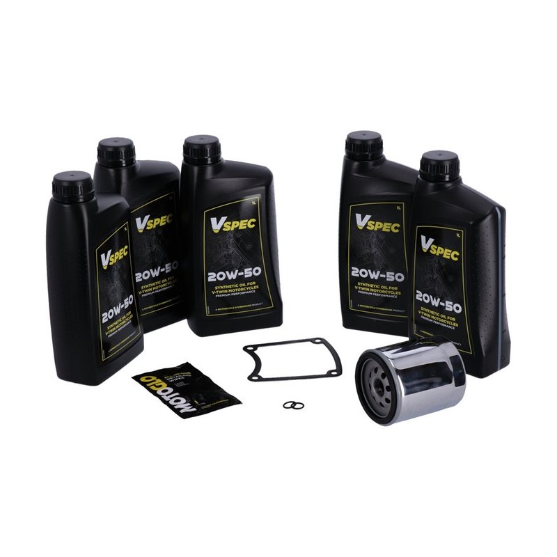 Ce kit comprend : 6 litres d'huile moteur/boîte primaire/transmission 100% synthétique SAE 20W50 3-en-1, un filtre à huile chromé 63798-99A, un joint de couvercle d'inspection 34906-85D et un joint torique pour bouchon de vidange 11105. Huile Vspec 20W50 100% synthétique de haute qualité. Formule spéciale tout-en-un pour moteur, boîte primaire et transmission. Miscible avec toutes les huiles minérales et semi-synthétiques. Conforme ou supérieur à la norme JASO MA/2. Notre kit « Big Oil » contient la quantité d'huile Vspec nécessaire pour l'entretien des modèles mentionnés. Il inclut un filtre à huile vissable chromé ou noir, tous les joints de bouchon de vidange et un joint de couvercle d'inspection/de boîte primaire. Le kit « Big Oil » est idéal pour une vidange complète de votre moto lors d'un entretien périodique ou avant l'hivernage. Remarque : Contient une huile moteur Vspec authentique de haute qualité, adaptée à tous les moteurs, des modèles de série aux moteurs haute performance. Remarque : Les références des pièces d'origine sont fournies à titre indicatif uniquement. Remarque : L'huile usagée peut contenir des acides nocifs et/ou d'autres contaminants. Il est donc conseillé d'effectuer une vidange d'huile et un changement de filtre avant l'hivernage. Remarque : Consultez votre manuel d'entretien pour connaître les intervalles de vidange et les quantités d'huile recommandés par le constructeur.