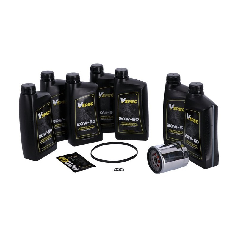 Ce kit comprend : 7 litres d'huile moteur/boîte primaire/transmission 100% synthétique SAE 20W50 3-en-1, un filtre à huile chromé 62700296, un joint torique de couvercle de carter 17369-06 et un joint torique de bouchon de vidange 11105. Huile Vspec 20W50 100% synthétique de haute qualité. Formule spéciale tout-en-un pour moteur, boîte primaire et transmission. Miscible avec toutes les huiles minérales et semi-synthétiques. Conforme ou supérieur à la norme JASO MA/2. Notre kit « Big Oil » contient suffisamment d'huile Vspec pour moteur, boîte de vitesses et boîte primaire pour l'entretien des modèles mentionnés. Le kit inclut un filtre à huile vissable chromé ou noir, tous les joints de bouchon de vidange nécessaires et un joint de couvercle de carter/d'inspection primaire. Le kit « Big Oil » est idéal pour une vidange complète de votre moto lors d'un entretien périodique ou avant l'hivernage. Remarque : Contient une huile moteur Vspec authentique de haute qualité pour tous les moteurs, des modèles de série aux moteurs haute performance. Remarque : Les références des pièces d'origine sont fournies à titre indicatif uniquement. Remarque : L'huile usagée peut contenir des acides nocifs et/ou d'autres contaminants. Il est donc conseillé d'effectuer une vidange d'huile et un changement de filtre avant l'hivernage. Remarque : Consultez votre manuel d'entretien pour connaître les intervalles de vidange et les quantités d'huile recommandés par le constructeur.