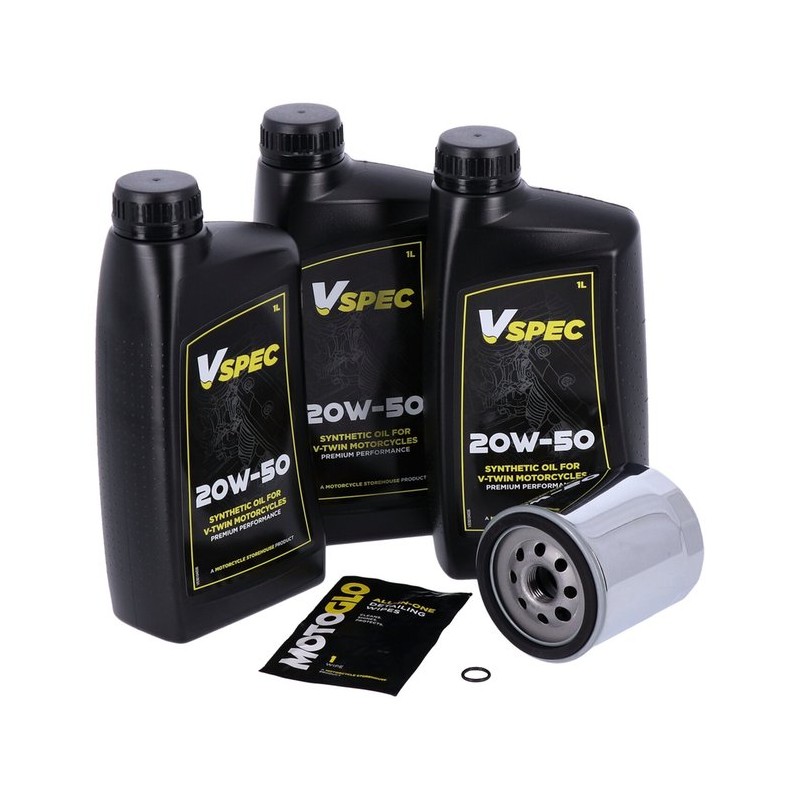 Bidon de 3 litres. Filtre à huile chromé (63798-99A / 63731-99A). Kit d'entretien de base comprenant un filtre à huile, un bouchon de vidange avec joint torique et la quantité d'huile moteur nécessaire pour le modèle spécifié. Utilisé pour l'entretien de votre moto lors d'une révision périodique ou avant l'hivernage. Remarque : Livré avec de l'huile moteur 100 % synthétique Vspec de haute qualité, compatible avec tous les moteurs, de série à haute performance, nécessitant une huile synthétique. Remarque : L'huile usagée peut contenir des acides nocifs et/ou d'autres contaminants. Il est donc conseillé de procéder à une vidange d'huile et au remplacement du filtre avant l'hivernage. Remarque : Consultez votre manuel d'entretien pour connaître les intervalles de vidange recommandés par le constructeur.