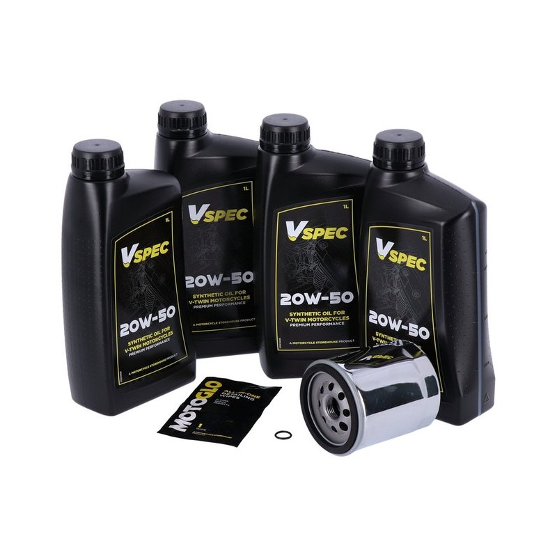 Bidon de 4 litres. Filtre à huile chromé (modèles 63798-99A / 63731-99A). Kit d'entretien de base comprenant un filtre à huile, un bouchon de vidange avec joint torique et suffisamment d'huile moteur pour le modèle spécifié. Utilisé pour l'entretien de votre moto lors d'une révision périodique ou avant l'hivernage. Remarque : Livré avec de l'huile moteur 100 % synthétique Vspec de haute qualité, compatible avec tous les moteurs, de série à haute performance, nécessitant une huile moteur synthétique. Remarque : L'huile usagée peut contenir des acides nocifs et/ou d'autres contaminants. Il est donc conseillé de procéder à une vidange d'huile et au remplacement du filtre avant l'hivernage. Remarque : Consultez votre manuel d'entretien pour connaître les intervalles de vidange recommandés par le constructeur.