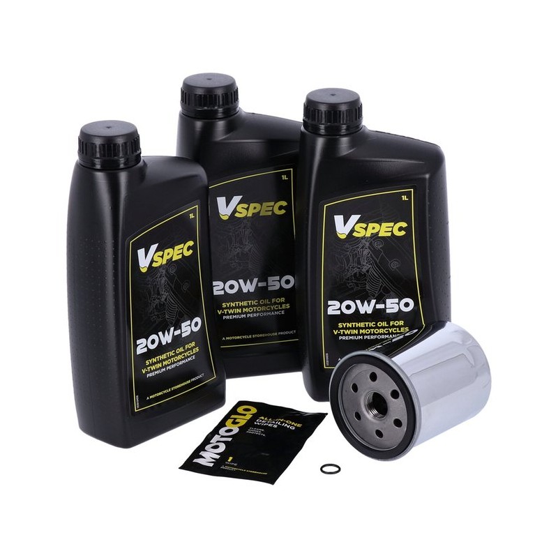 Bidon de 3 litres. Filtre chromé (références 63796-77A / 63805-80A). Kit d'entretien de base comprenant un filtre à huile, un bouchon de vidange avec joint torique et suffisamment d'huile moteur pour le modèle spécifié. Utilisé pour l'entretien de votre moto lors d'une révision périodique ou avant l'hivernage. Remarque : Livré avec de l'huile moteur 100 % synthétique Vspec de haute qualité, compatible avec tous les moteurs, de série à haute performance, nécessitant une huile synthétique. Remarque : L'huile usagée peut contenir des acides nocifs et/ou d'autres contaminants. Il est donc conseillé de procéder à une vidange et au remplacement du filtre avant l'hivernage. Remarque : Consultez votre manuel d'entretien pour connaître les intervalles de vidange recommandés par le constructeur.