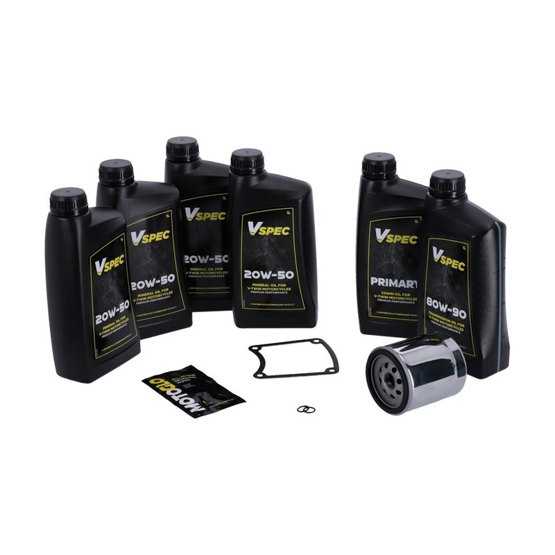 Ce kit comprend : 4 litres d'huile moteur minérale SAE 20W50, un filtre à huile chromé 63798-99A, 1 litre d'huile pour carter primaire, 1 litre d'huile de transmission 80W90, un joint de couvercle d'inspection 34906-85D et un bouchon de vidange avec joint torique 11105. Huile moteur minérale multigrade Vspec SAE 20W50 de haute qualité pour motos nécessitant une huile moteur minérale. Conforme ou supérieure à la norme JASO MA/2. Notre kit « Big Oil » contient suffisamment d'huile Vspec pour moteur, transmission et carter primaire pour l'entretien des modèles mentionnés. Le kit inclut un filtre à huile vissable chromé ou noir, tous les joints de bouchon de vidange nécessaires et un joint de couvercle d'inspection/de carter primaire. Le kit « Big Oil » est idéal pour une vidange complète de votre moto lors d'un entretien périodique ou avant l'hivernage. Remarque : Contient de l'huile moteur Vspec authentique de haute qualité pour tous les moteurs, des modèles de série aux moteurs haute performance. Remarque : Les références OEM sont données à titre indicatif uniquement. Remarque : L’huile usagée peut contenir des acides nocifs et/ou d’autres contaminants. Il est donc conseillé de procéder à une vidange d’huile et au remplacement du filtre avant l’hivernage. Remarque : Consultez votre manuel d’entretien pour connaître les intervalles de vidange et les quantités d’huile recommandés par le constructeur.