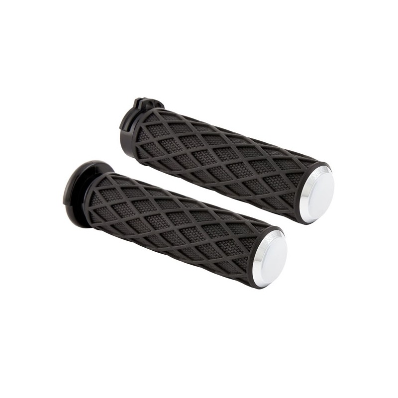 Plaqué argent. Aluminium usiné CNC avec caoutchouc noir. Design diamant vintage, avec moletage intégré à chaque diamant pour un look précis. Excellente adhérence, toucher et résistance à l'usure grâce à l'utilisation d'un caoutchouc de qualité supérieure. Logo Arlen Ness gravé au laser sur les embouts. Remarque : Le nouveau tube de poignée interne s'installe comme les poignées d'origine, sans colle, pour une installation simple et rapide.